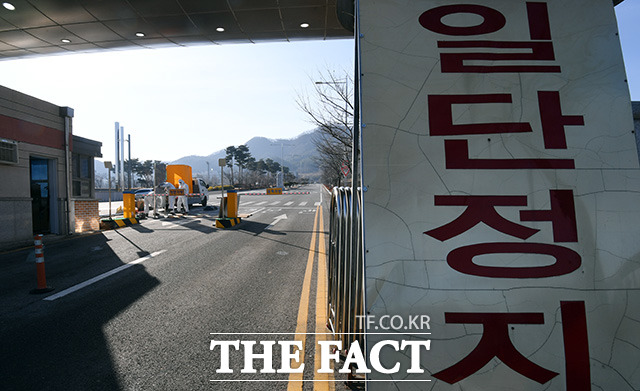 [더팩트ㅣ아산=임영무 기자] 중국 우한의 교민들의 임시생활거처로 충남 아산 경찰인재개발원이 정해진 가운데 30일 오전 충남 아산 온양동 경찰인재개발원 입구에는 방역벽이 설치되고 있다.