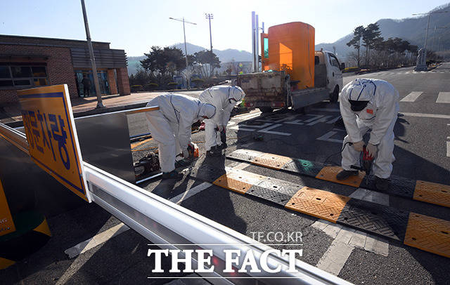 [더팩트ㅣ아산=임영무 기자] 중국 우한의 교민들의 임시생활거처로 충남 아산 경찰인재개발원이 정해진 가운데 30일 오전 충남 아산 온양동 경찰인재개발원 입구에는 방역벽이 설치되고 있다.