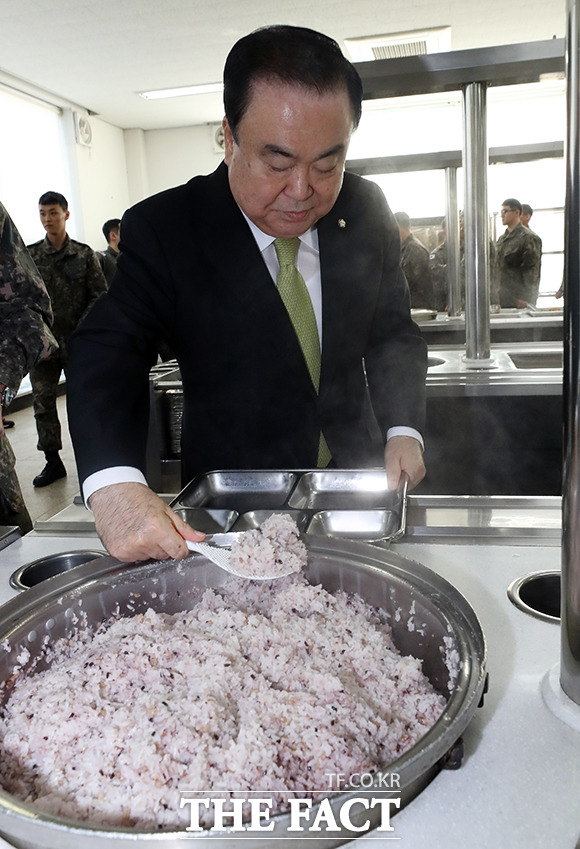 [더팩트ㅣ원주=국회사진취재단] 문희상 국회의장이 30일 오전 강원도 원주시 제8전투비행단을 방문해 오찬을 앞두고 직접 배식하고 있다.