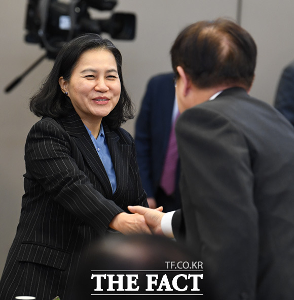 [더팩트ㅣ임세준 기자] 유명희 통상교섭본부장(왼쪽)이 30일 오후 서울 강남구 트레이드타워 대회의실에서 열린 '통상지원센터 개소식' 행사에 참석해 김영주 한국무역협회장과 악수하고 있다.