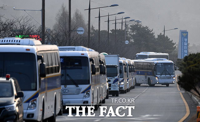 [더팩트ㅣ아산=임영무 기자] 중국 우한의 교민들을 태운 전세기가 귀국한 31일 오전 충남 아산시 경찰인재개발원 앞은 경찰 버스가 입구를 둘러싸고 있다. 정부는 중국 우한에서 발생한 신종 코로나 바이러스로 인해 귀국하는 교민들의 임시생활거처로 충남 아산 경찰인재개발원과 충북 진천 국가공무원인재개발원 2개소를 지정했다.