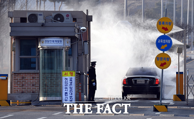 [TF포토] 철저한 방역 하는 아산 경찰인재개발원