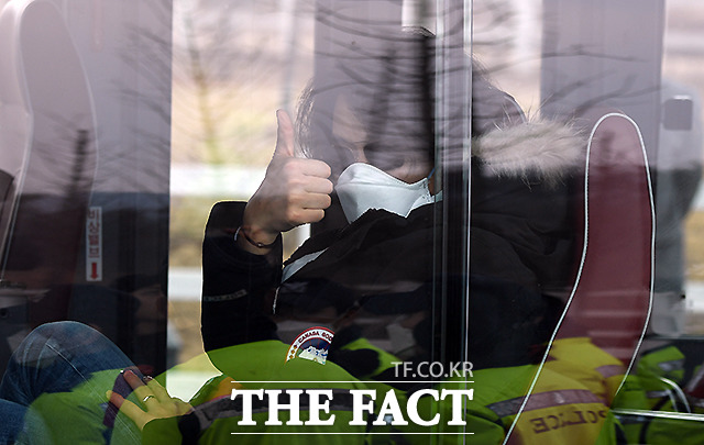 [더팩트ㅣ진천=이새롬 기자] 신종 코로나 바이러스 감염증의 진원지로 알려진 중국 후베이성 우한에서 귀국한 교민 150여명을 태운 버스가 31일 오후 충북 진천군 국가공무원인재개발원으로 들어가는 가운데, 한 탑승객이 엄지를 치켜 들어보이고 있다.