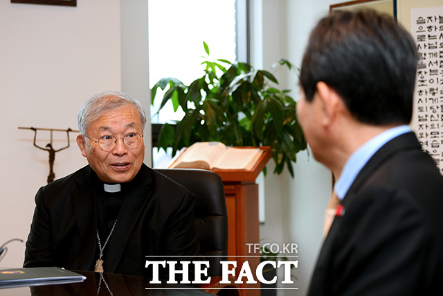 [더팩트|이선화 기자] 염수정 추기경(왼쪽)이 31일 오후 서울 중구 한국천주교서울대교구청을 찾은 정세균 국무총리와 대화를 나누고 있다.