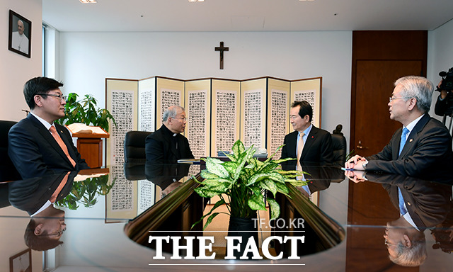 [더팩트|이선화 기자] 정세균 국무총리(왼쪽에서 세번째)가 31일 오후 서울 중구 한국천주교서울대교구청에서 염수정 추기경(왼쪽에서 두번째)을 예방해 대화를 나누고 있다.