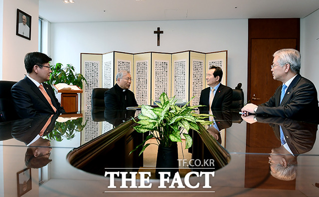 [더팩트|이선화 기자] 정세균 국무총리(오른쪽)가 31일 오후 서울 중구 한국천주교서울대교구청에서 염수정 추기경을 예방해 대화를 나누고 있다.