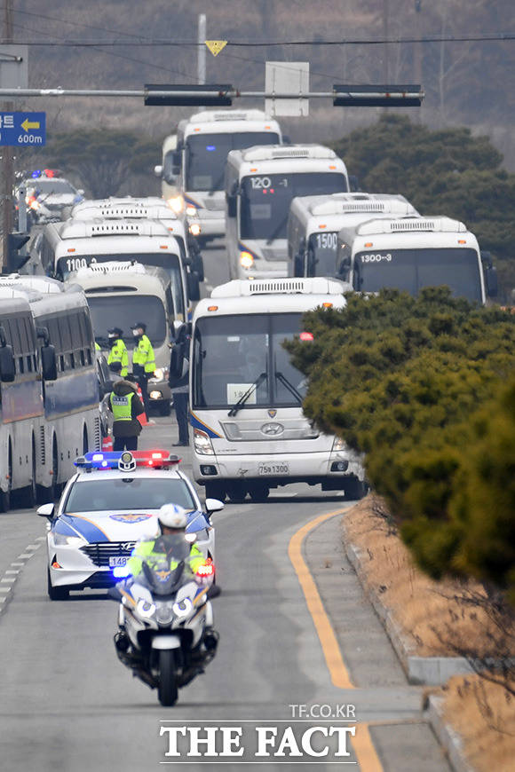 [더팩트ㅣ아산=남용희 기자] 신종 코로나 바이러스 감염증의 진원지로 알려진 중국 후베이성 우한에서 2차로 귀국한 교민들을 태운 버스가 1일 오후 충남 아산 경찰인재개발원으로 이동하고 있다.