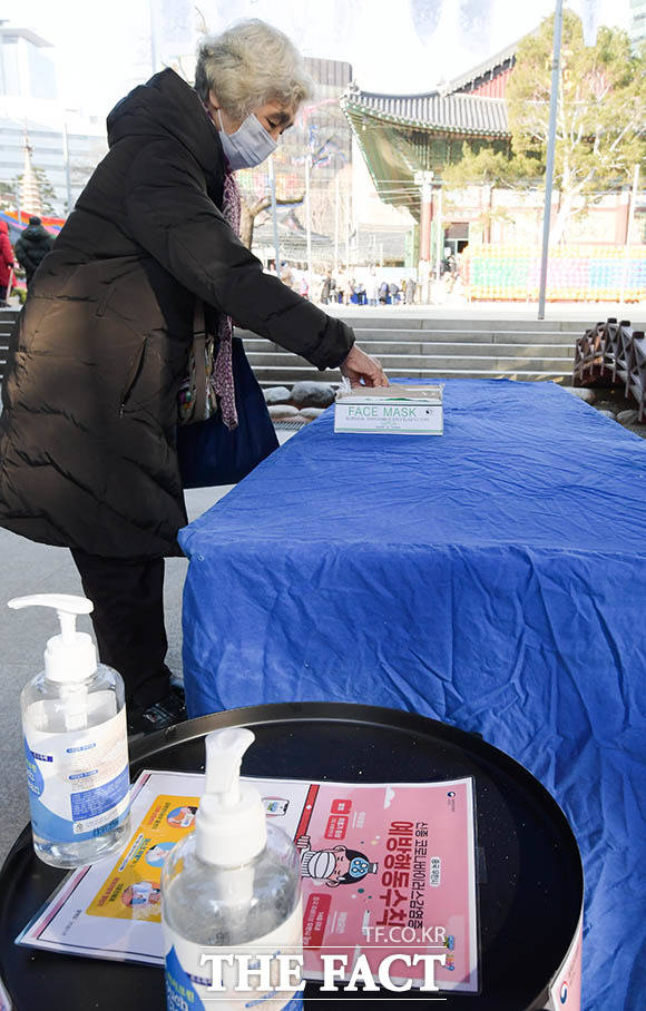 [더팩트ㅣ김세정 기자] 절기상 입춘인 4일 오전 입춘기도를 위해 서울 종로구 조계사를 찾은 시민이 신종 코로나 바이러스 감염증에 대한 우려로 입구에 비치된 마스크를 하나 가져가고 있다.