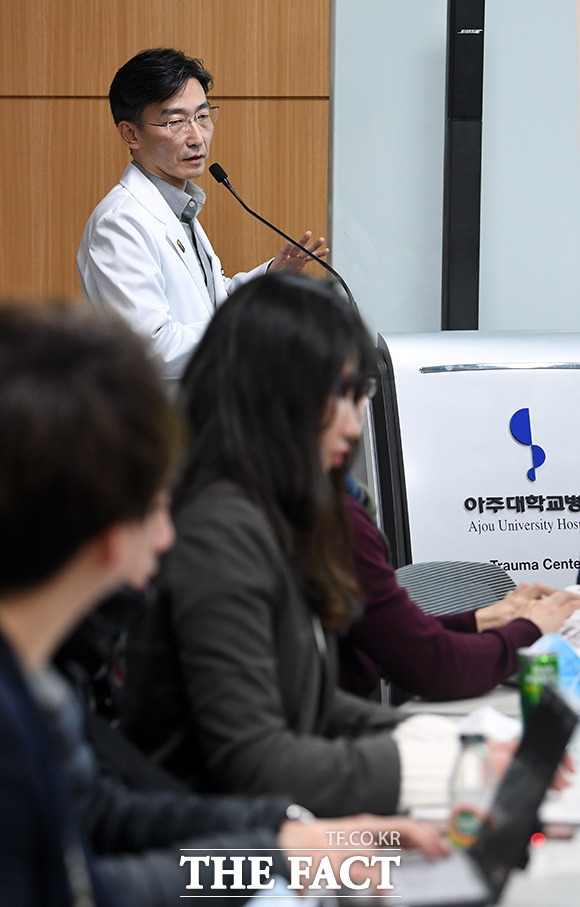 [더팩트ㅣ수원=임영무 기자] 아주대학교 권역외상센터장을 사임한 이국종 교수가 5일 오전 경기도 수원 아주대학교 권역외상센터에서 취재진에게 최근 불거진 아주대 병원측의 중중외상환자 진료방해, 진료 거부등 의혹들을 설명하고 있다.
