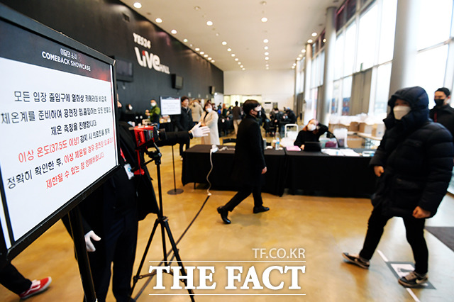 [더팩트|이선화 기자] 신종 코로나 바이러스 감염증 확산에 따른 불안이 커지고 있는 가운데 5일 오후 서울 광진구 예스24라이브홀에서 열리는 걸그룹 이달의 소녀 미니앨범 '해시(#) 컴백 쇼케이스 시작에 앞서 관계자가 입장하는 취재진을 대상으로 발열 체크를 하고 있다.