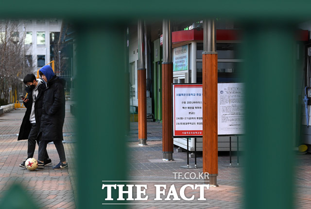 [더팩트ㅣ임세준 기자] 목운초등학교 재학생의 학부모 1명이 신종 코로나바이러스 감염증 자가격리 및 능동감시대상자로 통보받은 가운데 5일 오후 서울 양천구 목운초등학교에서 학생들이 휴교로 인해 닫힌 학교를 빠져나가고 있다.