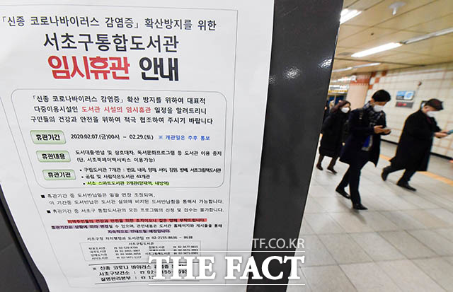 [더팩트ㅣ김세정 기자] 신종 코로나바이러스 감염증이 확산되고 있는 가운데 7일 오전 서울 서초구 양재역에 설치된 스마트 도서관에 감염증의 확산 방지를 위해 당분간 임시 휴관을 한다는 안내문이 게시돼 있다.