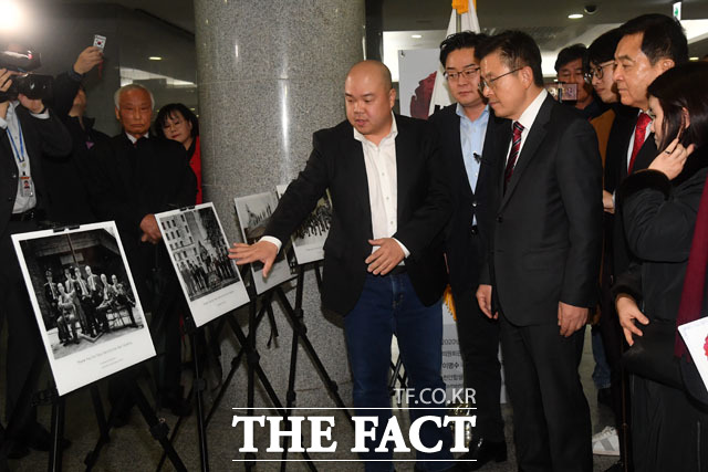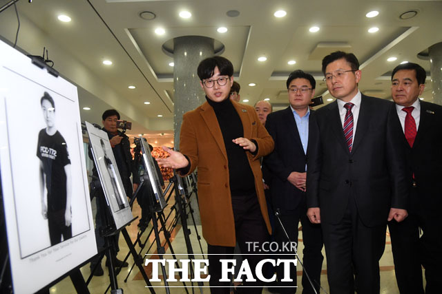 [더팩트 | 국회=남윤호 기자] 황교안 자유한국당 대표가 12일 오후 서울 여의도 국회 의원회관에서 열린 6.25 70주년 및 천안함 10주기 기념 국군문화 사진전을 찾아 전시된 사진에 고개를 숙이고 있다.