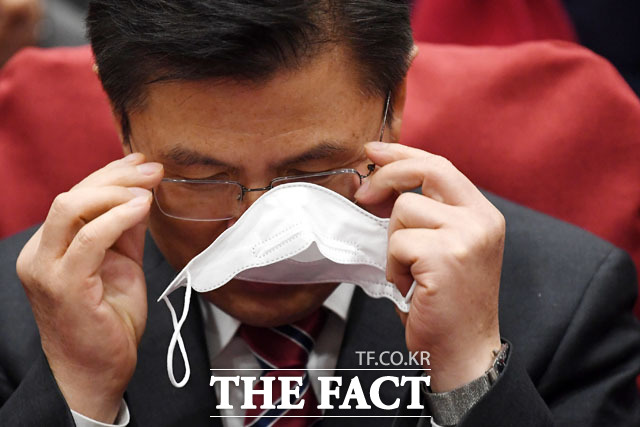 [더팩트 | 국회=남윤호 기자] 황교안 자유한국당 대표가 13일 오전 서울 여의도 국회 의원회관에서 열린 전국위원회에 참석해 마스크를 벗고 안경을 고쳐쓰고 있다.