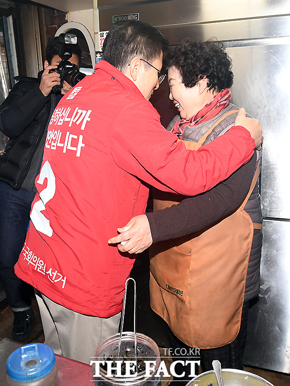 [더팩트ㅣ이새롬 기자] 4.15 총선 종로에 출마하는 황교안 자유한국당 대표가 13일 오후 서울 종로구 창신동 일대 시장을 찾아 한 상인과 포옹하고 있다. saeromli@tf.co.kr 사진부 photo@tf.co.kr