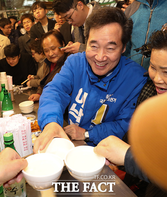 [더팩트ㅣ이동률 기자] 4.15총선에서 더불어민주당 후보로 종로에 출마하는 이낙연 전 국무총리가 15일 오후 서울 종로구 광장시장을 찾아 시민들과 막걸리를 마시며 건배를 하고 있다.
