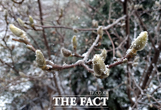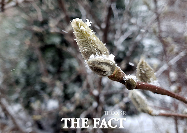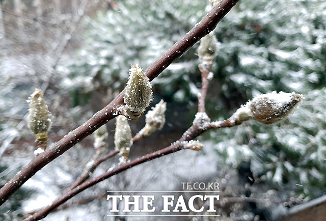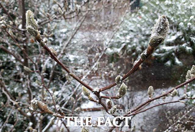 [더팩트ㅣ이효균 기자] 16일 오전 서울 서초구 방배동 주택가에 핀 목련이 눈에 쌓이고 있다. 이날 전국에 비나 눈이 오다가 오전에 대부분 그치고 서울·경기·강원 영서에서는 밤까지 산발적으로 눈이 날리겠다.