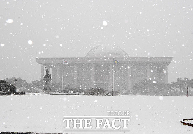 [더팩트ㅣ배정한 기자] 서울에 대설주의보가 내려진 16일 낮 서울 여의도 국회의사당에 눈이 내려 쌓이고 있다. 서울 등 수도권 일부 지역과 제주도 산지에 대설주의보가 내려졌다. 경기 북부와 강원 북부·산지에는 16일 밤 한파주의보가 발효된다. 한편, 눈은 서풍이 약화하는 오후까지 지속되며 1∼3㎝가량 쌓일 것으로 예상된다. hany@tf.co.kr 사진영상기획부 photo@tf.co.kr