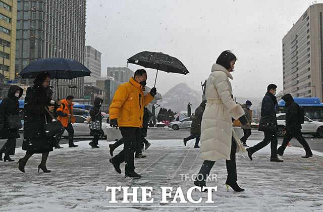 [더팩트ㅣ이동률 기자] 전국 대부분 지역에 눈이 내린 17일 오전 서울 종로구 광화문역 인근의 직장인들이 발걸음을 재촉하고 있다.이날 전국 대부분 지역에 눈이 내리다가 서울·경기도 지역은 낮에 그칠것이라고 기상청은 전망했다.fedaikin@tf.co.kr사진영상기획부 photo@tf.co.kr