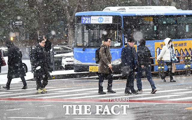 [더팩트ㅣ이동률 기자] 전국 대부분 지역에 눈이 내린 17일 오전 서울 종로구 광화문역 인근의 직장인들이 발걸음을 재촉하고 있다.