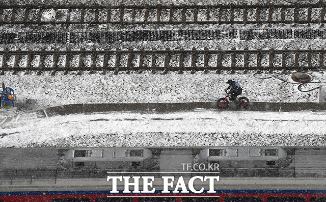 [더팩트ㅣ이동률 기자] 전국 대부분 지역에 눈이 내린 17일 오후 서울 마포구 수색 차량기지에 눈이 쌓인 가운데 관계자가 자전거를 타고 이동하고 있다.이날 전국 대부분 지역에 눈이 내리다가 서울·경기도 지역은 오후 늦게 그칠것이라고 기상청은 전망했다.fedaikin@tf.co.kr사진영상기획부 photo@tf.co.kr