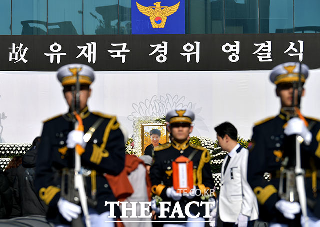 [더팩트ㅣ이덕인 기자] 한강에서 투신자를 수색하던 중 숨진 고 유재국 경위의 영결식이 18일 오전 서울 송파구 경찰병원에서 진행되고 있다.