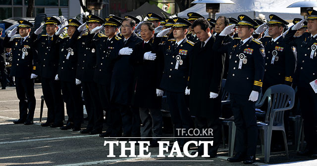 [더팩트ㅣ이덕인 기자] 한강에서 투신자를 수색하던 중 숨진 고 유재국 경위의 영결식이 18일 오전 서울 송파구 경찰병원에서 진행된 가운데 동료들이 경례를 하고 있다.