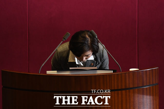 [더팩트 | 국회=남윤호 기자] 추미애 법무부 장관이 18일 오전 서울 여의도 국회에서 열린 2월 임시국회 본회의에 참석해 신임 국무위원으로서 인사를 하고 있다.