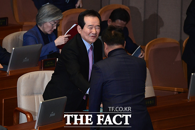 [더팩트|국회=이선화 기자] 정세균 국무총리(왼쪽)가 18일 오전 서울 여의도 국회에서 열린 2월 임시국회 본회의를 마치고 의원들과 인사를 나누고 있다.seonflower@tf.co.kr사진영상기획부 photo@tf.co.kr