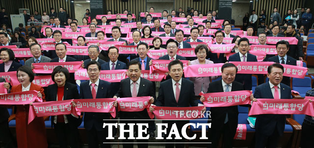 [더팩트 | 국회=남윤호 기자] 황교안 미래통합당 대표(왼쪽에서 다섯 번째)와 심재철 원내대표(왼쪽에서 네 번째)를 비롯한 의원들이 18일 오전 서울 여의도 국회에서 열린 의원총회에서 구호를 외치고 있다.