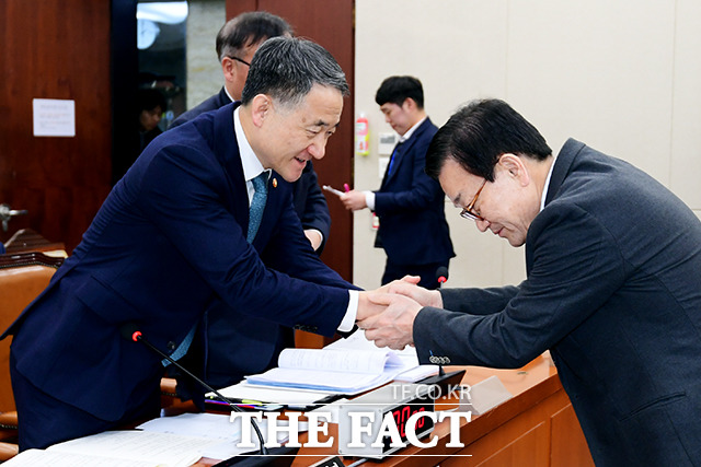 [더팩트|국회=이선화 기자] 박능후 보건복지부 장관(왼쪽)이 18일 오후 서울 여의도 국회에서 열린 보건복지위원회 전체회의에 의원들과 악수하고 있다.