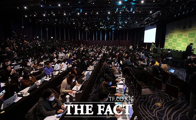 [더팩트|이선화 기자] 영화 '기생충' 기자회견이 19일 오전 서울 중구 웨스틴조선호텔 서울에서 열린 가운데 많은 취재진이 대기하고 있다.