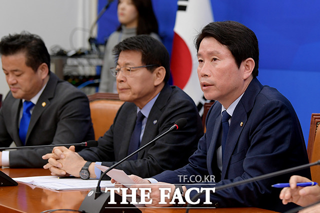 [더팩트|국회=이선화 기자] 이인영 더불어민주당 원내대표(오른쪽)가 20일 오전 서울 여의도 국회에서 열린 정책조정회의에 참석해 모두발언을 하고 있다.