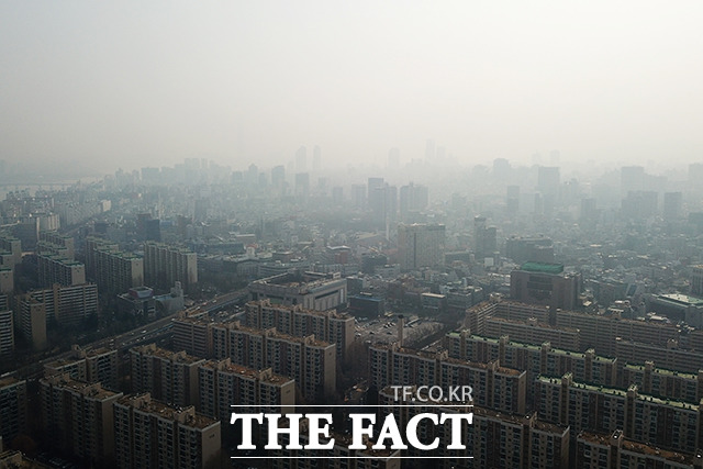 [더팩트ㅣ배정한 기자] 미세먼지 농도가 나쁨 수준을 보이는 20일 오전 서울 서초구 잠원한강공원에서 바라본 서울 도심이 뿌옇게 보이고 있다.