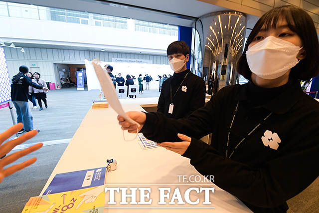 [더팩트ㅣ김세정 기자] '2020 화랑미술제'가 20일 오전 서울 강남구 삼성동 코엑스 전시홀에서 열린 가운데 관계자가 입구에서 관람객들에게 코로나19 예방을 위해 마스크를 나눠주고 있다.