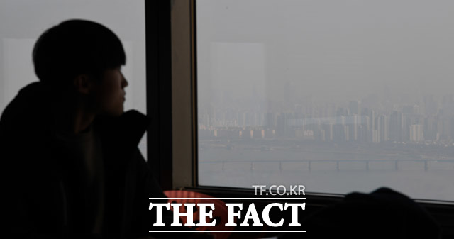 [더팩트ㅣ임세준 기자] 전국적으로 초미세먼지가 나쁨 수준을 보인 20일 오후 서울 영등포구 여의도 63빌딩 전망대를 찾은 한 관광객이 뿌연 도심을 바라보고 있다.