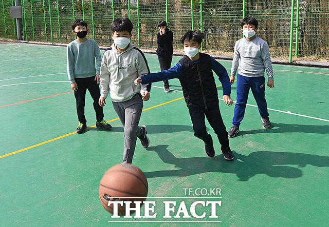 [더팩트ㅣ이동률 기자] 코로나19 여파로 전국 유치원·초중고 개학이 1주일 연기된 24일 오후 서울 마포구의 한 초등학교 운동장에서 어린이들이 마스크를 쓴 채 농구를 하고 있다.지난 23일 교육부는 전국 유치원, 초등학교, 중학교, 고등학교 개학을 3월 9일까지 1주일 연기한다고 밝혔다.fedaikin@tf.co.kr사진영상기획부 photo@tf.co.kr