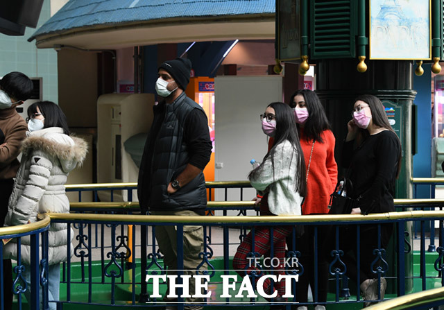 [더팩트ㅣ임세준 기자] 24일 오후 서울 송파구의 한 놀이동산에서 관광객들이 마스크를 끼고 놀이기구를 타기위해 줄을 서고 있다.