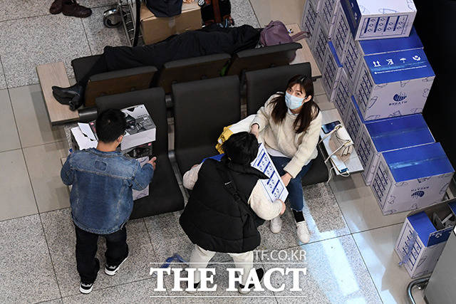 [더팩트ㅣ인천국제공항=남용희 기자] 24일 오후 인천국제공항 1터미널에서 외국인들이 마스크를 박스째 옮기로 있다.