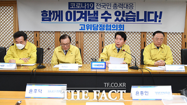 [더팩트ㅣ배정한 기자] 이인영 더불어민주당 원내대표(왼쪽 세번째) 25일 오전 서울 여의도 더불어민주당 중앙당사에서 열린 당정협의회에 참석해 모두발언을 하고 있다. hany@tf.co.kr 사진영상기획부 photo@tf.co.kr