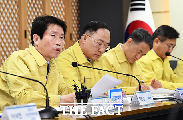 [더팩트ㅣ배정한 기자] 이인영 더불어민주당 원내대표(왼쪽)가 25일 오전 서울 여의도 더불어민주당 중앙당사에서 열린 당정협의회에 참석해 모두발언을 하고 있다.