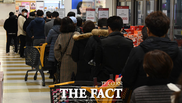 [더팩트ㅣ임세준 기자] 전국적으로 코로나19 확진자가 속출하고 있는 가운데 25일 오전 서울의 한 대형마트 입구에는 마스크를 구매하기 위한 시민들이 줄을 길게 서 있다.
