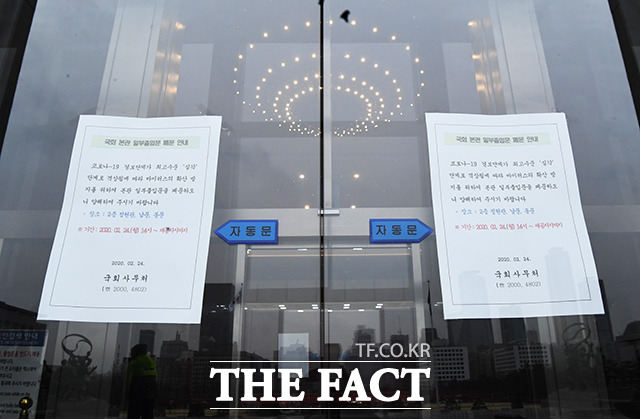 [더팩트ㅣ국회=배정한 기자] 25일 오전 코로나19 확진자가 다녀간 것으로 확인된 국회의 입구가 굳게 닫혀 있다. 지난 19일 국회에서 진행된 한 토론회에서 '코로나19' 확진자가 다녀간 것으로 확인되면서 24일부터 26일 오전까지 방역을 위해 국회 본관과 의원회간, 국회도서관이 폐쇄된다.