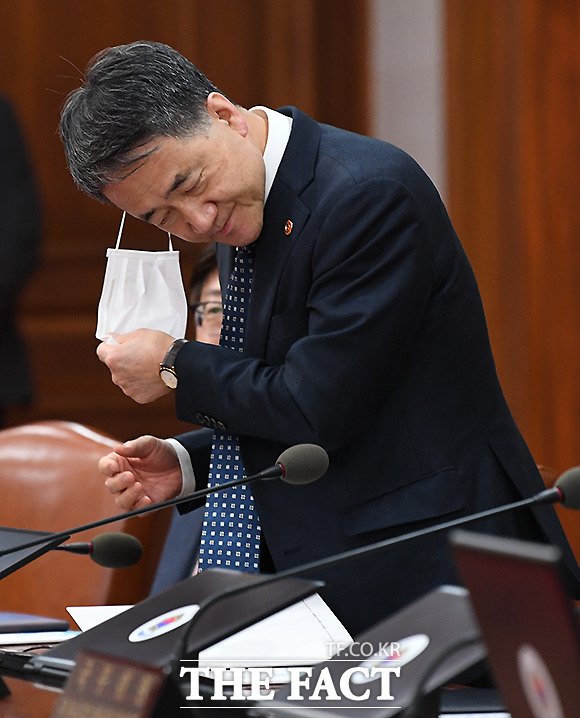 [더팩트ㅣ이새롬 기자] 박능후 보건복지부 장관이 25일 오전 서울 종로구 정부서울청사에서 열린 국무회의에 참석하며 마스크를 벗고 있다.