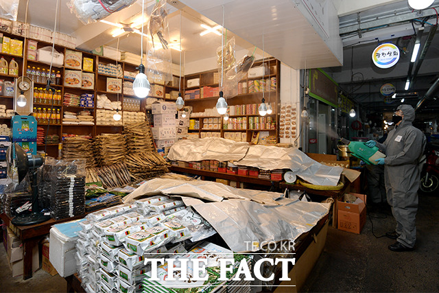[더팩트|이선화 기자] 코로나19 위기 경보가 '심각' 단계로 격상된 가운데 25일 오전 서울 은평구 대림시장에서 방역업체 직원들이 방역을 하고 있다.
