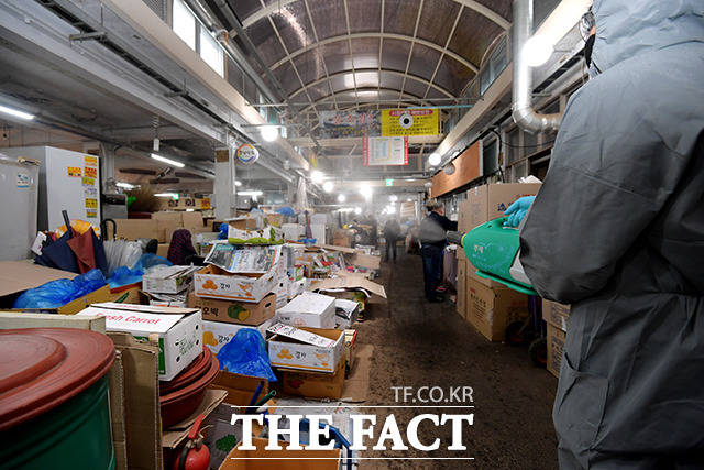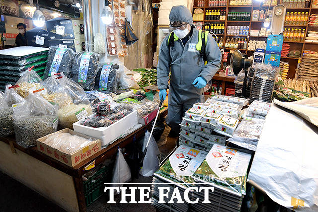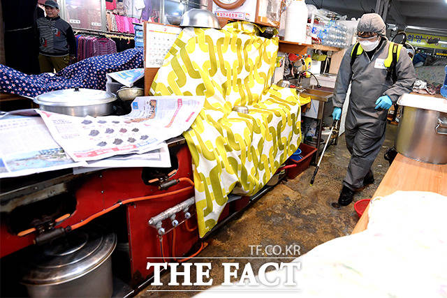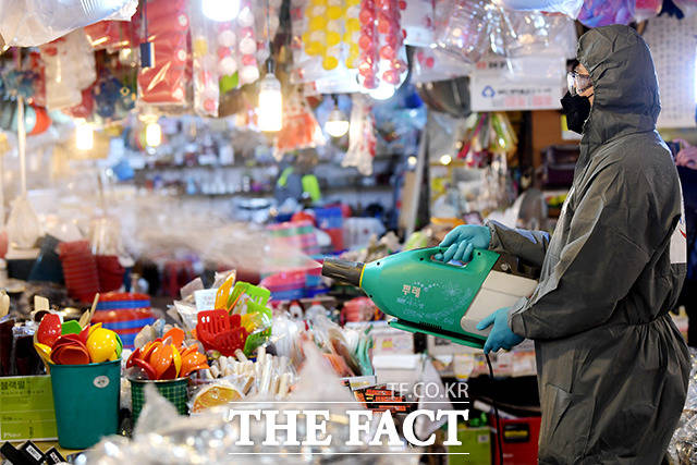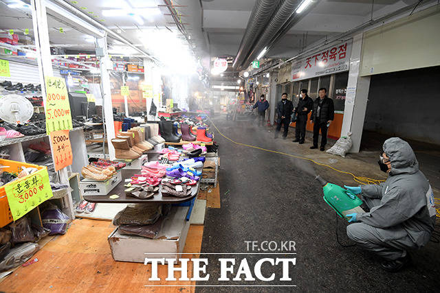 [더팩트|이선화 기자] 코로나19 위기 경보가 '심각' 단계로 격상된 가운데 25일 오전 서울 은평구 대림시장에서 방역업체 직원들이 방역을 하고 있다.