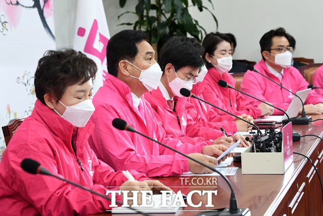 [더팩트 | 국회=남윤호 기자] 심재철 미래통합당 원내대표(왼쪽에서 두 번째)가 27일 오전 서울 여의도 국회에서 열린 최고위원회의에 참석해 발언하고 있다.
