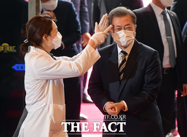 [더팩트 | 국회=남윤호 기자] 문재인 대통령이 28일 오후 서울 여의도 국회에 도착해 발열 검사를 받고 있다.