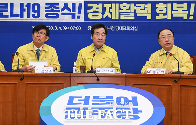 [더팩트ㅣ국회=배정한 기자] 홍남기 경제부총리(오른쪽)가 4일 오전 서울 여의도 국회에서 열린 더불어민주당 제1차 코로나19 대응 당정청회의에 참석해 모두발언을 하고 있다.