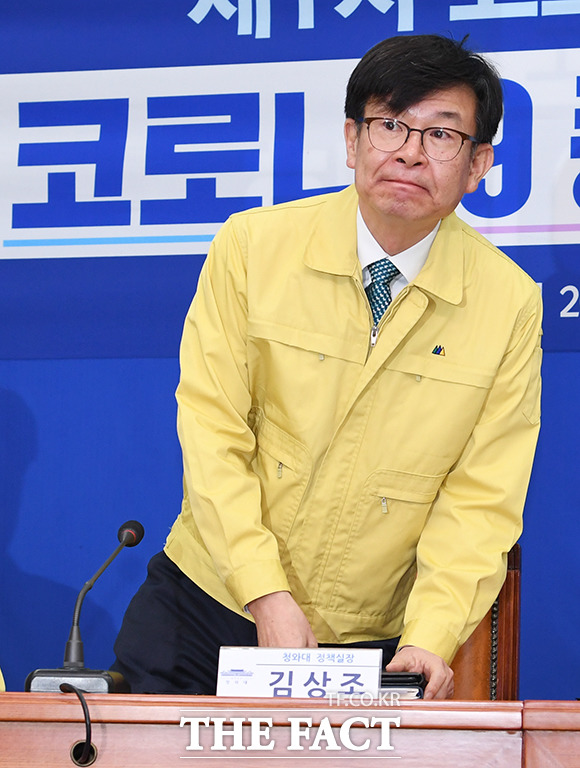 [더팩트ㅣ국회=배정한 기자] 김상조 청와대 정책실장이 4일 오전 서울 여의도 국회에서 열린 더불어민주당 제1차 코로나19 대응 당정청회의에 참석해 인사를 하고 있다.